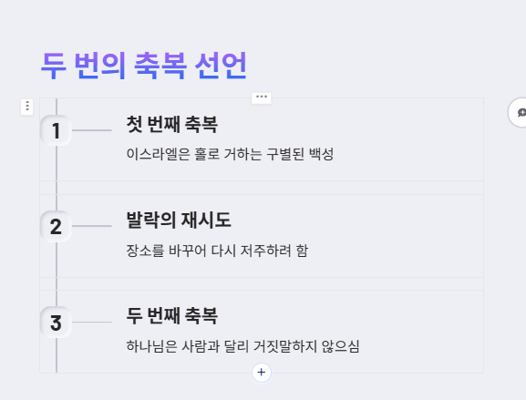 • 발락은 제단 7개를 쌓고 제물을 드리며 저주를 유도하지만, 하나님의 말씀이 임한 발람은 오히려 이스라엘을 축복합니다.