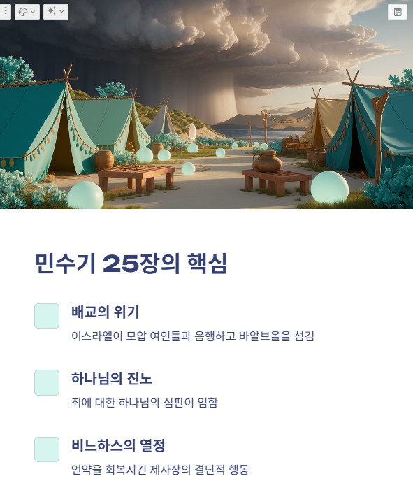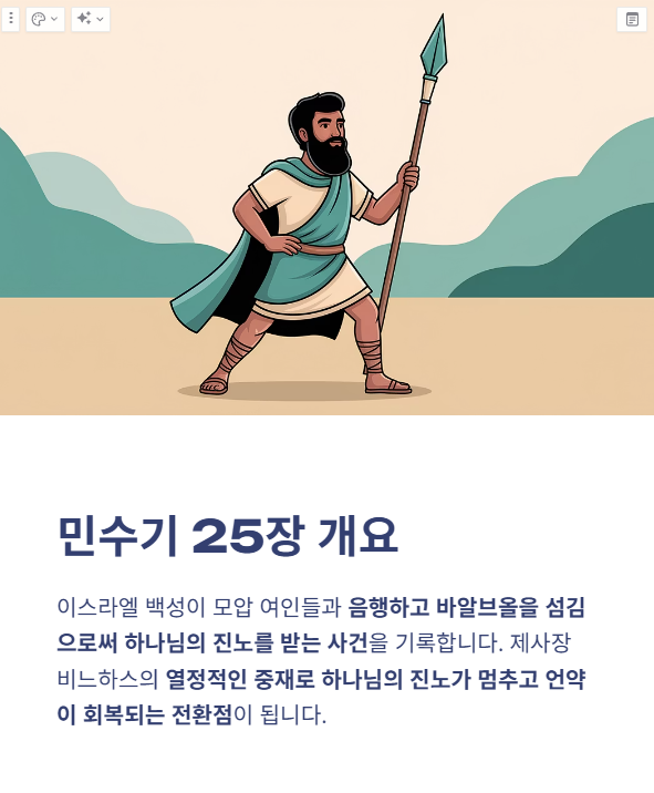 민수기 25장은 이스라엘 백성이 모압 여인들과 음행하고 바알브올을 섬김으로써 하나님의 진노를 받는 사건을 기록합니다. 그러나 제사장 비느하스의 열정적인 중재로 하나님의 진노가 멈추고 언약이 회복되는 전환점이 됩니다.