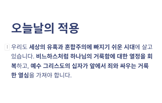 오늘날 신자도 세상의 유혹과 혼합주의에 빠지기 쉬운 시대에 살고 있습니다. 그럴 때 우리는 비느하스처럼 하나님의 거룩함에 대한 열정을 회복해야 하며, 공동체가 타협하지 않도록 기도와 행동으로 중보해야 합니다.