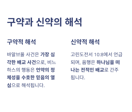 바알브올 사건은 출애굽 공동체가 광야 후반부에 겪은 가장 심각한 배교 사건 중 하나입니다. 우상 숭배와 성적 타락은 하나님의 언약을 깨뜨리는 이중적 범죄로 여겨졌으며, 비느하스의 행동은 언약의 정체성을 수호한 믿음의 열심으로 해석됩니다.