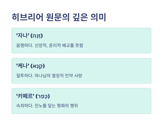 - ‘자나’ (זָנָה) – 음행하다. 신앙적, 윤리적 배교를 뜻하는 표현.