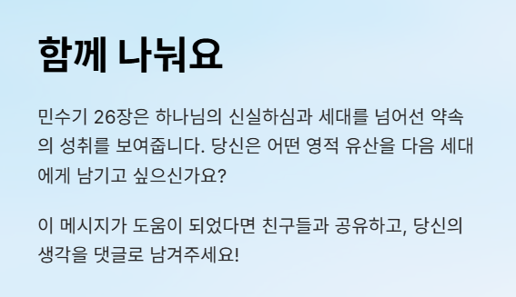 우리는 다음 세대를 위해 말씀과 믿음을 계승해야 하며, 각자의 자리에서 하나님의 기업을 유산처럼 물려줄 책임이 있습니다.