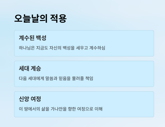 또한, 이 땅에서의 여정을 가나안을 향한 신앙의 여정으로 이해하며, 인생의 자리에서 하나님 나라 백성답게 살아가는 태도가 요구됩니다.