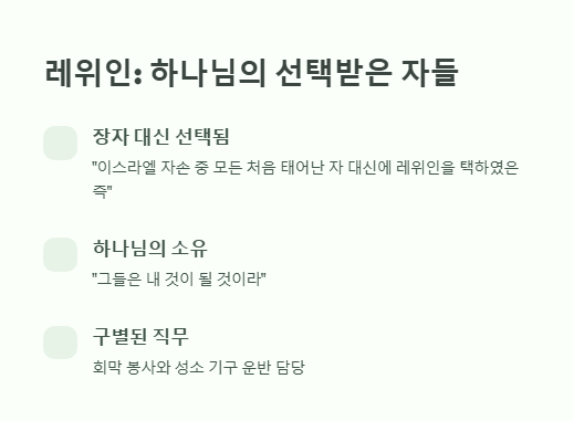 레위 자손 중 아론의 자손만이 제사장 직무를 감당하며, 나머지 레위인들은 회막의 봉사와 성소 기구 운반을 담당합니다 (3:5–10).