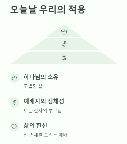 또한 모든 성도는 왕 같은 제사장으로 부르심을 받았으며, 하나님 앞에서 예배와 봉사의 삶을 살아가야 합니다 (벧전 2:9).