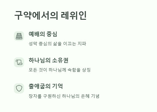 이는 예배의 중심에서 각자의 자리와 책임이 있음을 상징합니다. 또한 레위인을 이스라엘의 장자를 대신하여 하나님께 드리는 것은 구속과 속죄 개념의 예표입니다.