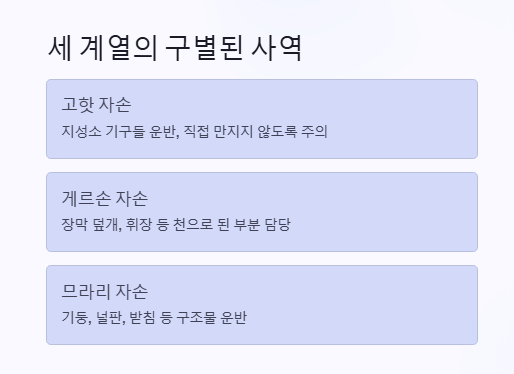 • 므라리 자손: 기둥, 널판, 받침 등 구조물 운반 담당 (4:29–33).