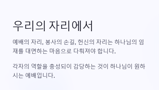 모든 사역은 크고 작음 없이 하나님 앞에서 거룩한 부르심이며, 우리는 각자의 역할을 충성되이 감당해야 합니다.