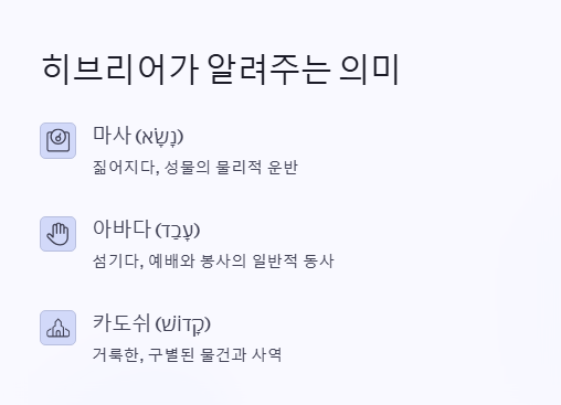 - ‘카도쉬’ (קָדוֹשׁ) – 거룩한. 구별된 물건과 장소, 사역의 성격.