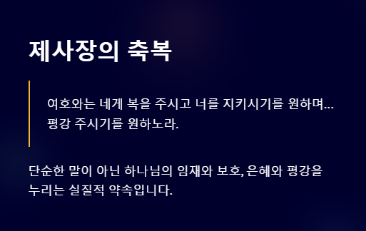 후반부에는 제사장이 백성을 향해 하나님의 이름으로 축복을 선언하는 기도문이 등장합니다. 이 축복은 단순한 말이 아니라, 하나님의 임재와 보호, 은혜와 평강을 누리는 실질적 약속입니다.