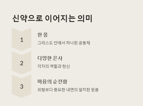 신약에서는 교회 공동체가 한 몸으로서 각자의 은사와 헌신을 통해 하나님의 집을 세운다는 개념으로 연결됩니다.