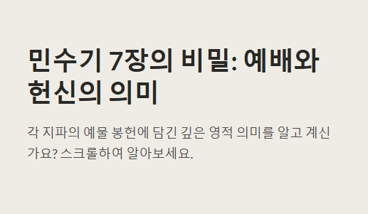 민수기 7장은 회막이 세워진 날에 각 지파가 하나님의 명령에 따라 예물을 바치는 장면을 상세하게 기록합니다. 이는 단순한 반복이 아니라, 각 지파의 동일한 순종과 헌신이 하나님 앞에 존중되었다는 의미를 전달합니다.