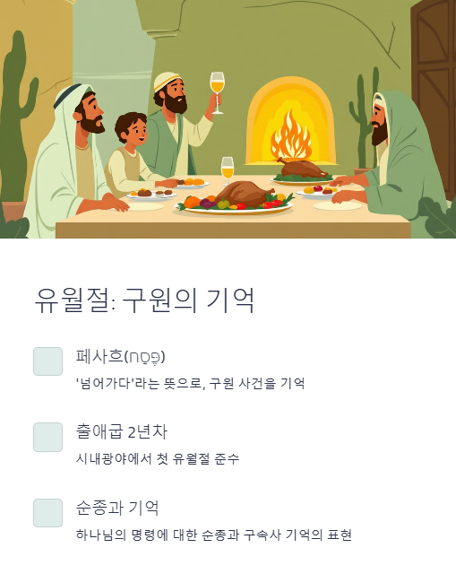 - ‘페사흐’ (פֶּסַח) – 유월절. ‘넘어가다’라는 뜻으로, 구원의 사건을 기억함.
