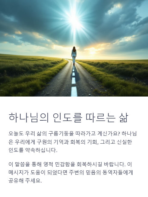 또한 내 뜻이 아니라, 구름기둥처럼 움직이시는 하나님의 뜻을 따라가는 영적 민감함이 오늘의 교회와 성도에게 절실합니다.