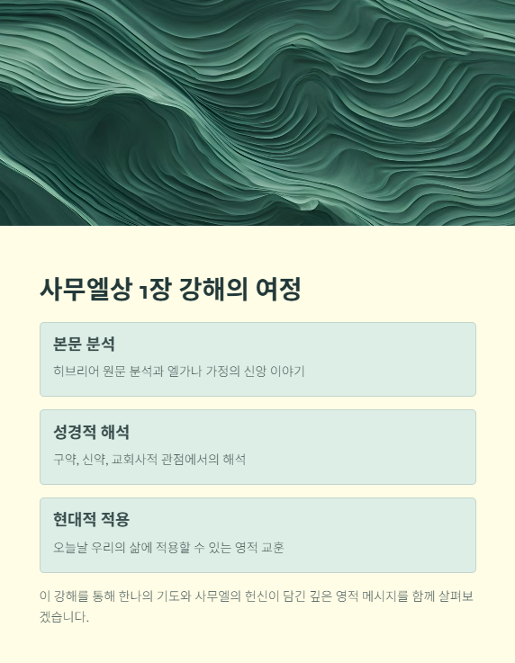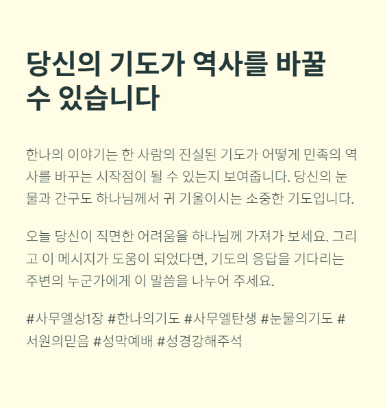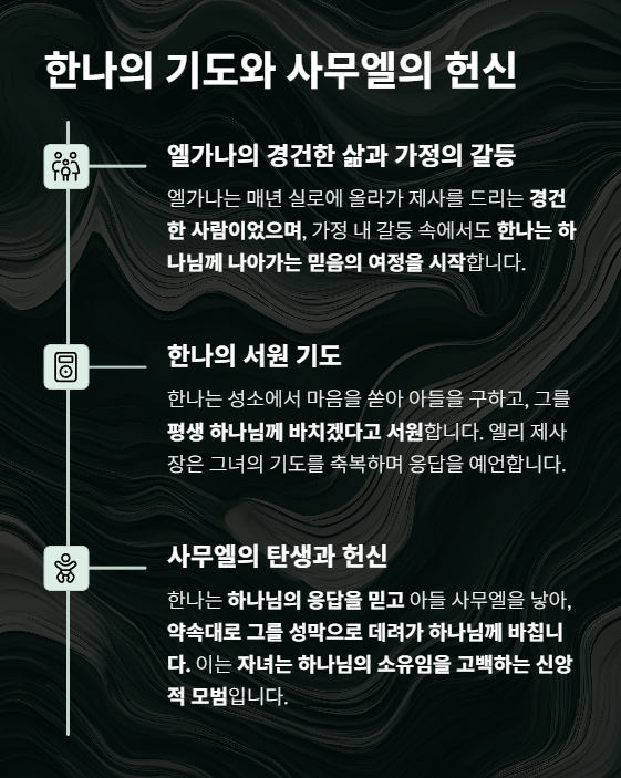 사무엘상 1장은 사무엘 선지자의 탄생 배경과 한나의 기도를 중심으로 한 감동적인 이야기입니다.