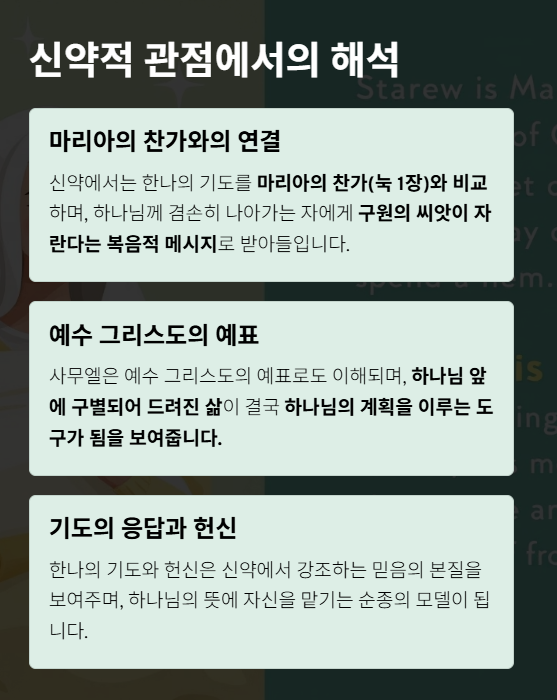 - ‘안나’ (חַנָּה) – 은혜. 한나의 이름 자체가 하나님의 은혜를 받은 자라는 의미.