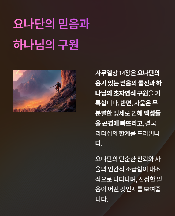 요나단의 단순한 신뢰와 사울의 인간적 조급함이 대조적으로 나타나며, 진정한 믿음이 어떤 것인지를 보여줍니다.