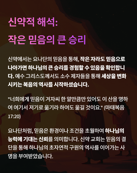 신약에서는 요나단의 믿음을 통해, 작은 자라도 믿음으로 나아가면 하나님의 큰 승리를 경험할 수 있음을 확인합니다.