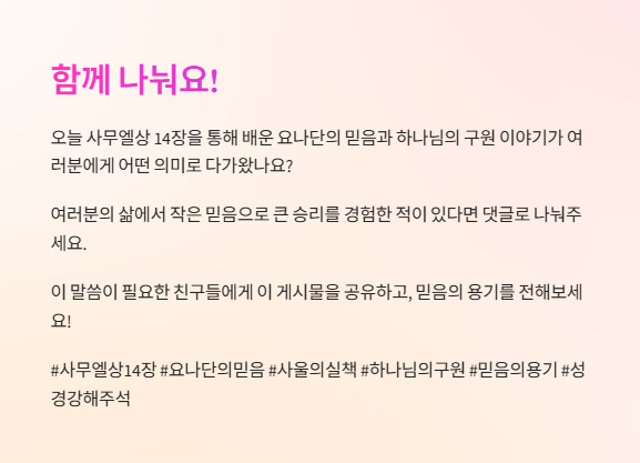 믿음은 숫자나 자원의 문제가 아니라, 하나님을 향한 신뢰와 순종의 문제임을 다시 새겨야 합니다.