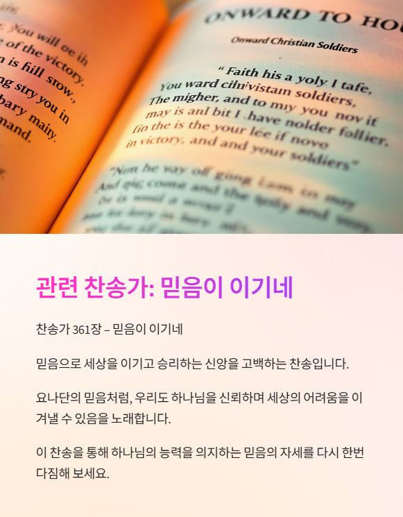 - "여호와께서 우리를 위하여 일하실까 하노라"는 말처럼, 승리를 전적으로 하나님께 맡깁니다.