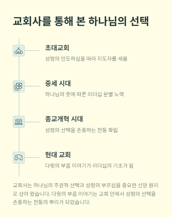 교회사는 하나님의 주권적 선택과 성령의 부르심을 중요한 신앙 원리로 삼아 왔습니다. 초대교회는 성령의 인도하심을 따라 지도자를 세웠고, 중세와 종교개혁 시대를 거치면서도 인간적 기준이 아니라 하나님의 뜻에 따라 리더십을 분별하려 했습니다. 다윗의 부름 이야기는 교회 안에서 성령의 선택을 존중하는 전통의 뿌리가 되었습니다.