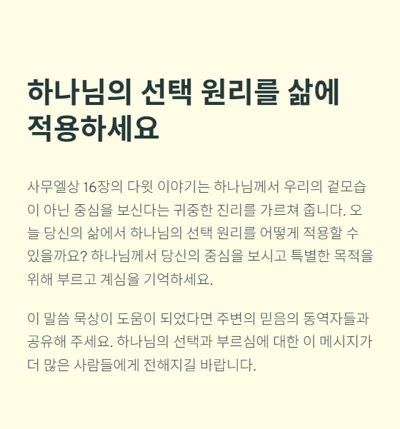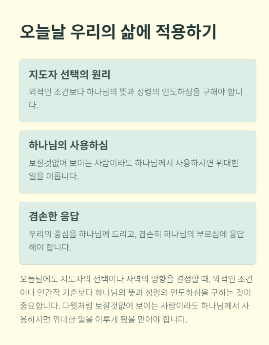 오늘날에도 지도자의 선택이나 사역의 방향을 결정할 때, 외적인 조건이나 인간적 기준보다 하나님의 뜻과 성령의 인도하심을 구하는 것이 중요합니다. 다윗처럼 보잘것없어 보이는 사람이라도 하나님께서 사용하시면 위대한 일을 이루게 됨을 믿어야 합니다. 우리의 중심을 하나님께 드리고, 겸손히 하나님의 부르심에 응답하는 삶이 요청됩니다.