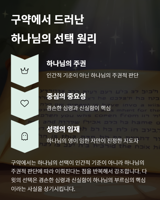 구약에서는 하나님의 선택이 인간적 기준이 아니라 하나님의 주권적 판단에 따라 이뤄진다는 점을 반복해서 강조합니다. 다윗의 선택은 겸손한 심령과 신실함이 하나님의 부르심의 핵심이라는 사실을 상기시킵니다. 또한 하나님의 영이 임한 자만이 진정한 지도자가 될 수 있음을 보여줍니다.