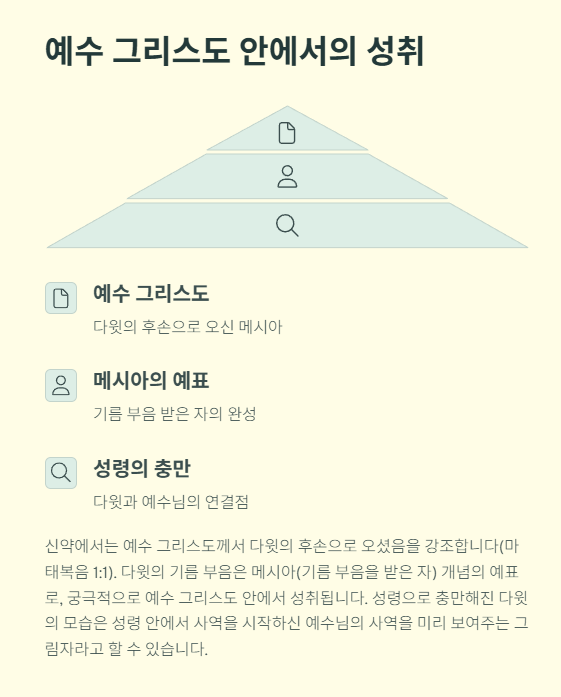 신약에서는 예수 그리스도께서 다윗의 후손으로 오셨음을 강조합니다(마태복음 1:1). 다윗의 기름 부음은 메시아(기름 부음을 받은 자) 개념의 예표로, 궁극적으로 예수 그리스도 안에서 성취됩니다. 성령으로 충만해진 다윗의 모습은 성령 안에서 사역을 시작하신 예수님의 사역을 미리 보여주는 그림자라고 할 수 있습니다.