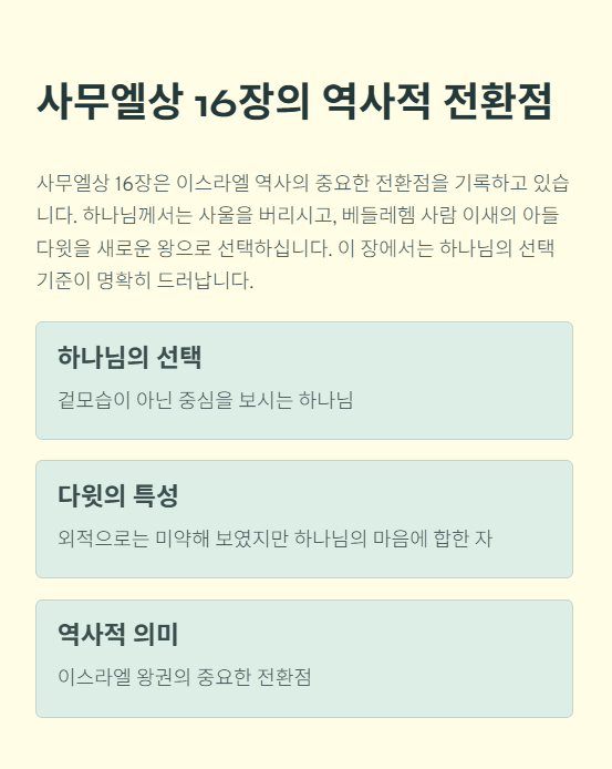 #사무엘상16장 #성경강해주석 #다윗의기름부음 #하나님의선택 #성령의임재 #신앙적리더십 #성경적적용