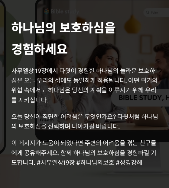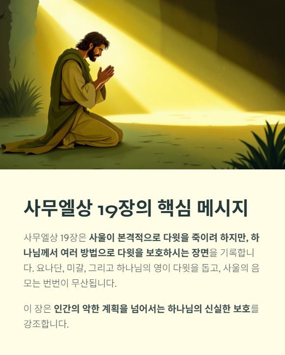 사무엘상 19장은 사울이 본격적으로 다윗을 죽이려 하지만, 하나님께서 여러 방법으로 다윗을 보호하시는 장면을 기록합니다.