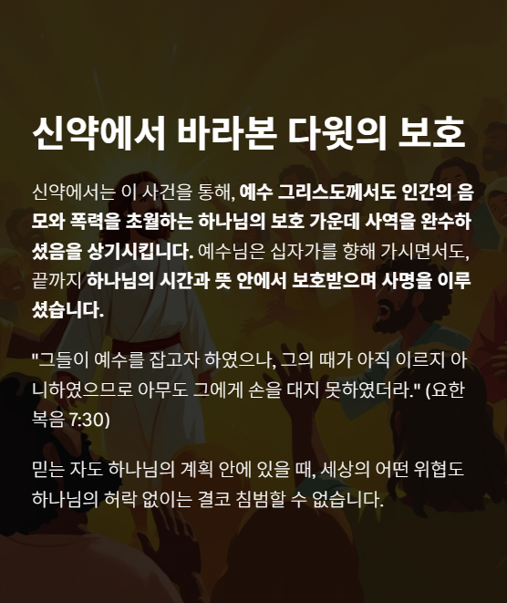 신약에서는 이 사건을 통해, 예수 그리스도께서도 인간의 음모와 폭력을 초월하는 하나님의 보호 가운데 사역을 완수하셨음을 상기시킵니다.