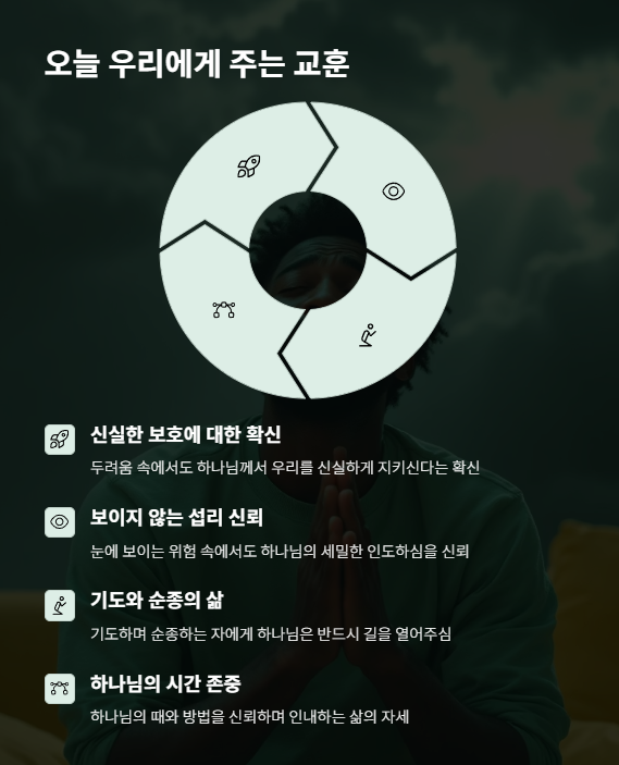 우리는 눈에 보이는 위험 속에서도, 하나님께서 우리 인생을 세밀히 인도하고 계심을 신뢰하며 걸어야 합니다.