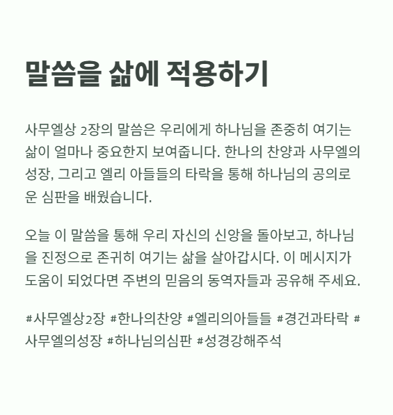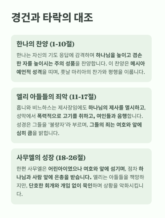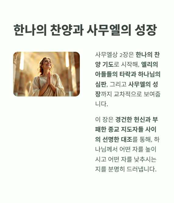 사무엘상 2장은 한나의 찬양 기도로 시작해, 엘리의 아들들의 타락과 하나님의 심판, 그리고 사무엘의 성장까지 교차적으로 보여줍니다.