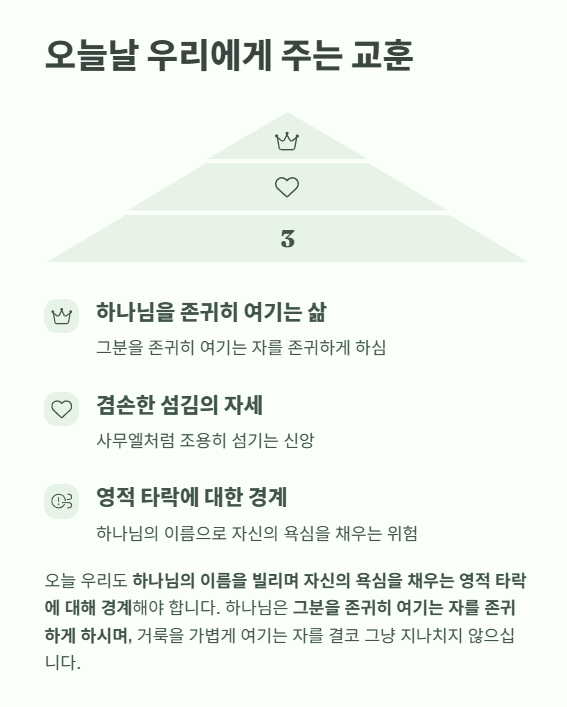 - 엘리는 아들들을 책망하지만, 단호한 회개와 개입 없이 묵인하며 상황을 악화시킵니다.