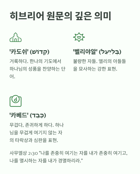 - ‘벨리야알’ (בְּלִיַּעַל) – 불량한 자들. 엘리의 아들들을 묘사하는 강한 표현.
