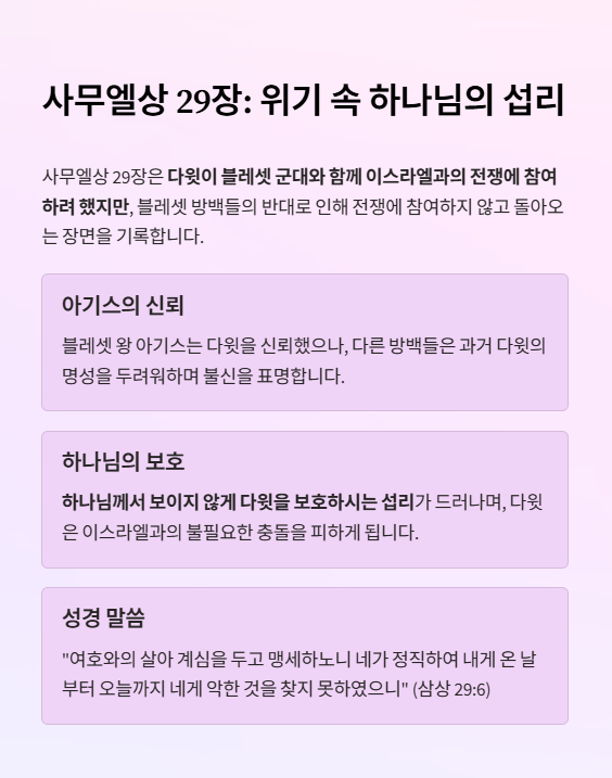 사무엘상 29장은 다윗이 블레셋 군대와 함께 이스라엘과의 전쟁에 참여하려 했지만, 블레셋 방백들의 반대로 인해 전쟁에 참여하지 않고 돌아오는 장면을 기록합니다. 블레셋 왕 아기스는 다윗을 신뢰했지만, 다른 방백들은 과거 다윗의 명성을 두려워하며 불신을 표명합니다. 이 장은 하나님께서 보이지 않게 다윗을 보호하시는 섭리를 드러내며, 다윗의 지혜로운 대응도 보여줍니다. 결과적으로 다윗은 이스라엘과의 불필요한 충돌을 피하고, 하나님의 계획 안에 머물게 됩니다.