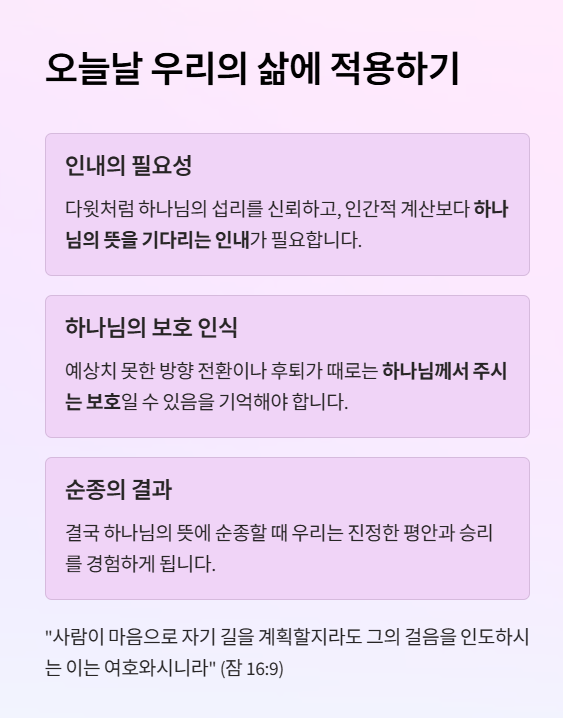 오늘날 신앙인들도 계획이 막히거나 뜻대로 되지 않을 때 좌절하거나 불평하기 쉽습니다. 그러나 다윗처럼 하나님의 섭리를 신뢰하고, 인간적 계산보다 하나님의 뜻을 기다리는 인내가 필요합니다. 예상치 못한 방향 전환이나 후퇴가 때로는 하나님께서 주시는 보호일 수 있음을 기억해야 합니다. 결국 하나님의 뜻에 순종할 때 우리는 진정한 평안과 승리를 경험하게 됩니다.