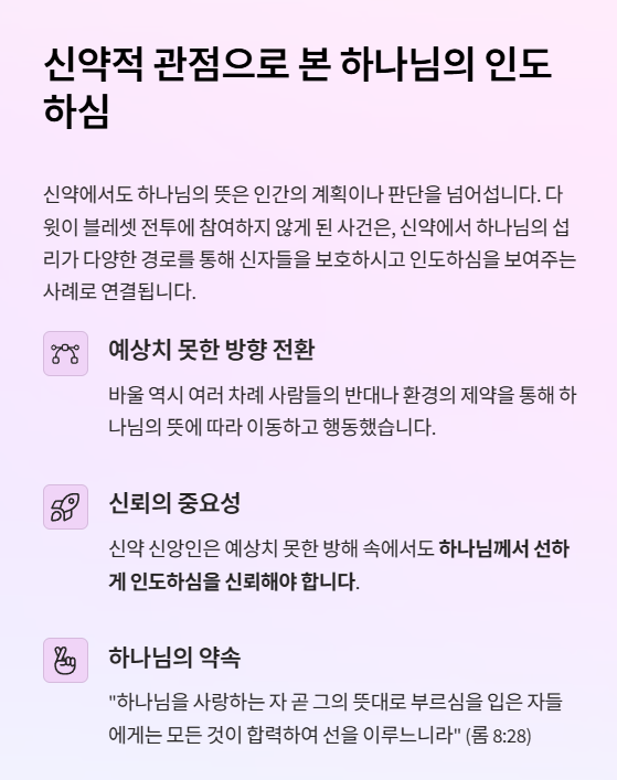 신약에서도 하나님의 뜻은 인간의 계획이나 판단을 넘어섭니다. 다윗이 블레셋 전투에 참여하지 않게 된 사건은, 신약에서 하나님의 섭리가 다양한 경로를 통해 신자들을 보호하시고 인도하심을 보여주는 사례로 연결됩니다. 바울 역시 여러 차례 사람들의 반대나 환경의 제약을 통해 하나님의 뜻에 따라 이동하고 행동했습니다. 신약 신앙인은 예상치 못한 방해 속에서도 하나님께서 선하게 인도하심을 신뢰해야 합니다.