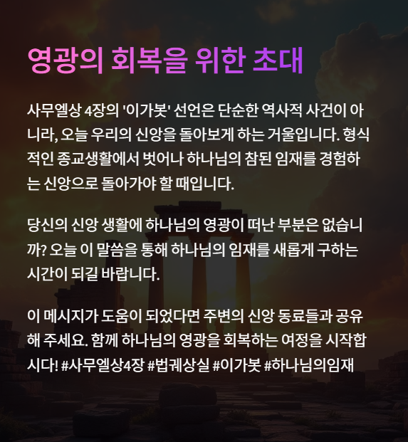 이가봇은 단순한 이름이 아니라, 하나님 없이 신앙생활을 이어가는 것의 공허함과 심판을 상징합니다.