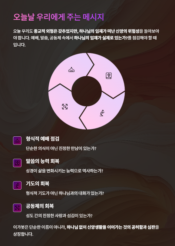 오늘 우리도 종교적 외형은 갖추었지만, 하나님의 임재가 떠난 신앙의 위험성을 돌아보아야 합니다.