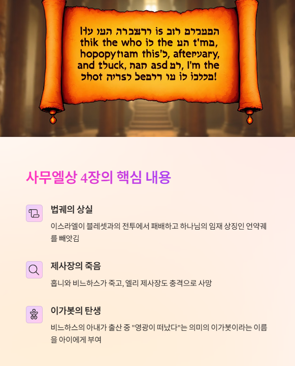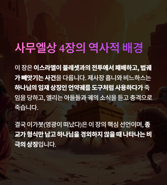 이 장은 이스라엘이 블레셋과의 전투에서 패배하고, 법궤가 빼앗기는 사건을 다룹니다.