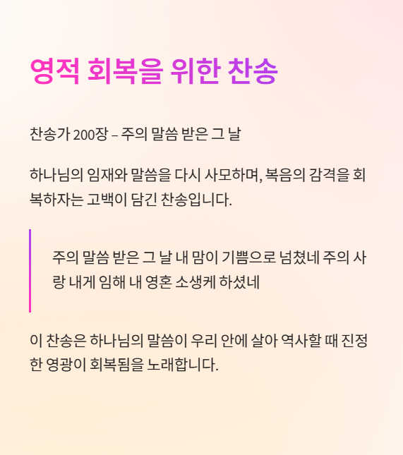 하나님의 임재와 말씀을 다시 사모하며, 복음의 감격을 회복하자는 고백이 담긴 찬송입니다.