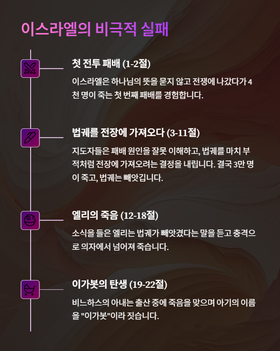 블레셋은 오히려 용기를 내어 전투에서 승리합니다. - 이스라엘은 3만 명이 죽고, 법궤는 빼앗기며, 두 제사장은 전사합니다.