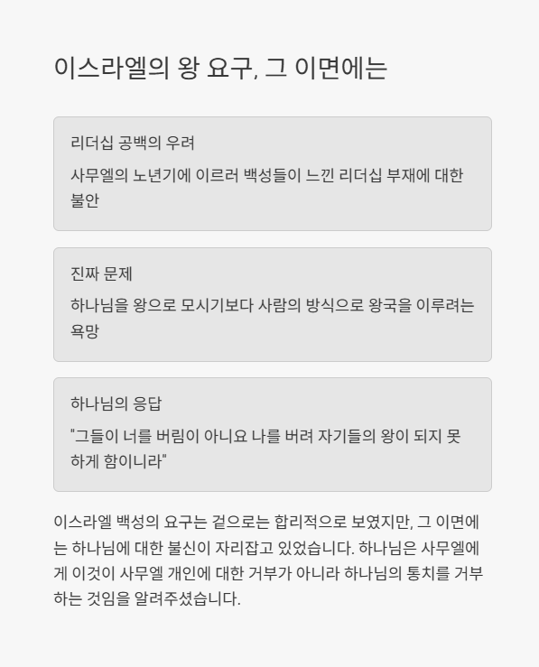 백성들의 요구는 단지 정치적 체제의 변화가 아니라, 하나님과의 관계에 대한 신뢰 결핍의 표현이었습니다.