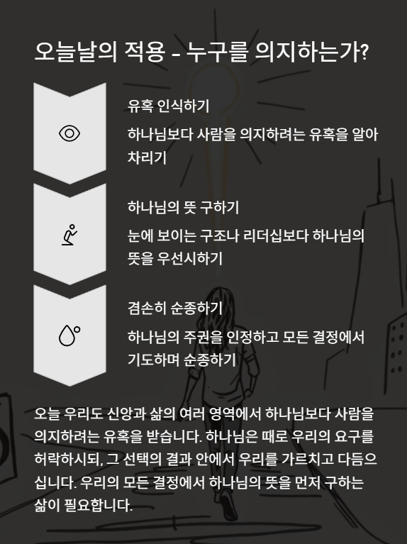 오늘 우리도 신앙과 삶의 여러 영역에서 하나님보다 사람을 의지하려는 유혹을 받습니다.