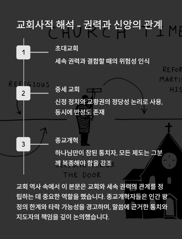또한 인간 왕정의 한계와 타락 가능성을 경고하며, 말씀에 근거한 통치와 지도자의 책임을 깊이 논의했습니다.