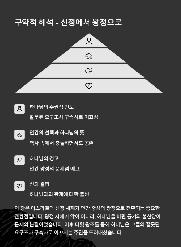 이 장은 이스라엘의 신정 체제가 어떻게 인간 중심의 왕정으로 전환되었는지를 보여주는 중요한 전환점입니다.