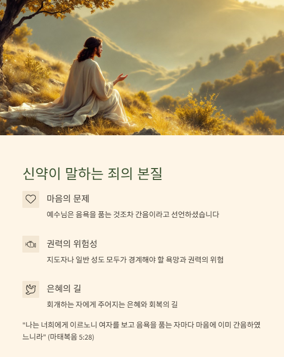 예수님은 산상수훈에서 음욕을 품는 것조차 간음이라고 선언하셨습니다. 이는 죄의 본질이 행동보다 마음에서 시작된다는 사실을 강조합니다. 다윗의 죄는 오늘날에도 지도자나 일반 성도 모두가 경계해야 할 욕망과 권력의 위험성을 경고합니다. 그러나 신약은 회개하는 자에게 주어지는 은혜와 회복의 길도 함께 제시합니다.