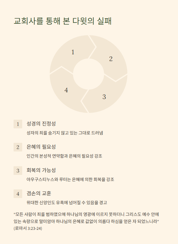 구약 율법에서는 간음과 살인은 명백한 사형에 해당하는 죄입니다. 그러나 왕인 다윗도 이 같은 죄를 범했다는 기록은, 성경이 인간의 연약함을 있는 그대로 기록하는 정직함을 보여줍니다. 동시에 이는 하나님의 은혜 없이는 어떤 인간도 의로울 수 없음을 강조합니다. 죄는 하나로 끝나지 않고, 욕망 → 행동 → 은폐 → 타인 희생의 과정으로 확장되는 특징을 가집니다.
