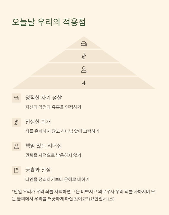 오늘날에도 우리는 다윗처럼 유혹과 자기 합리화에 빠질 수 있습니다. 그러나 죄를 외면하거나 은폐하는 것은 또 다른 죄와 피해를 낳을 뿐입니다. 정직한 자기 성찰과 회개, 그리고 책임 있는 리더십과 공동체 앞의 투명성이 반드시 필요합니다. 또한 은혜를 알 때 비로소 우리는 타인을 정죄하기보다 긍휼과 진실로 대할 수 있게 됩니다.